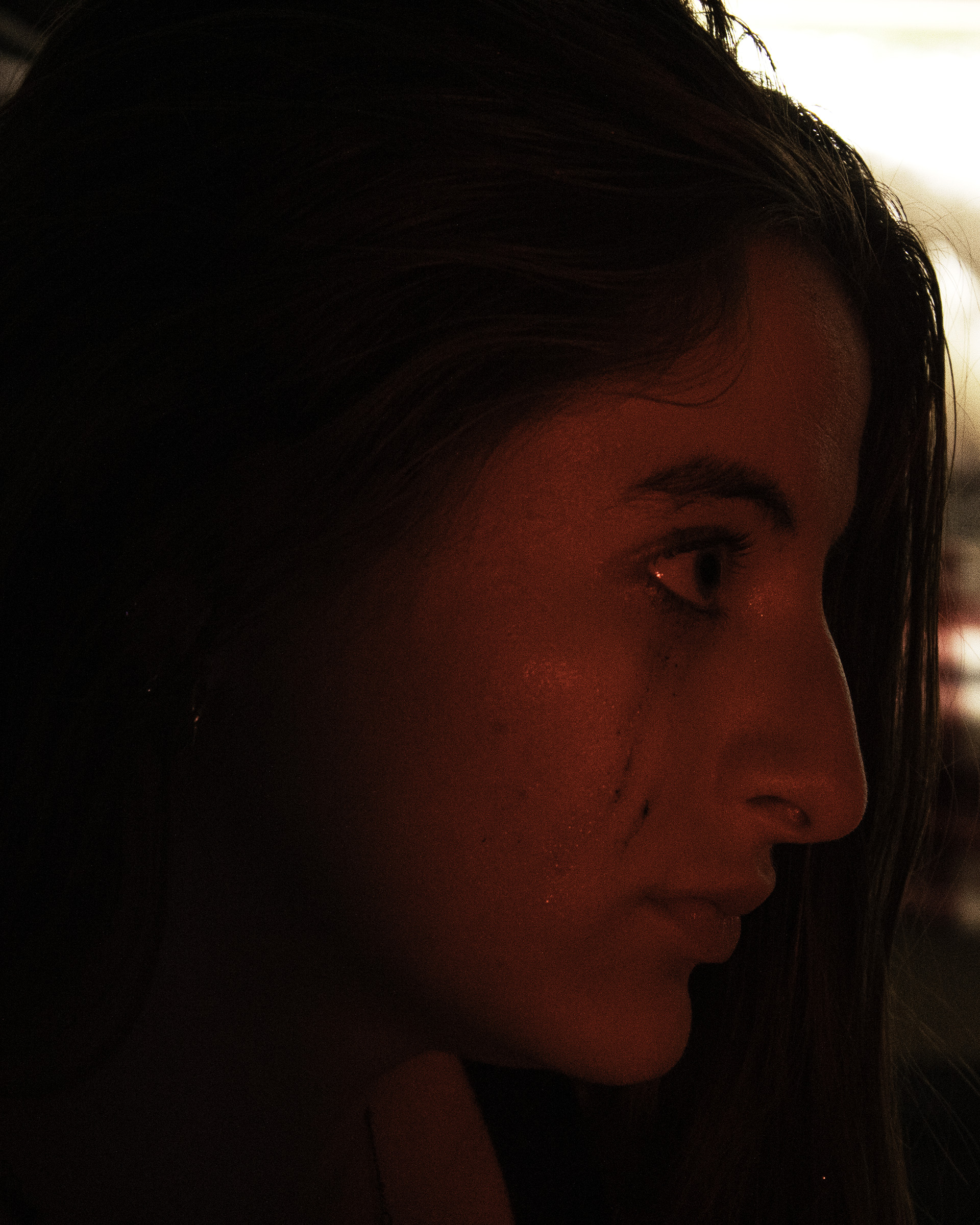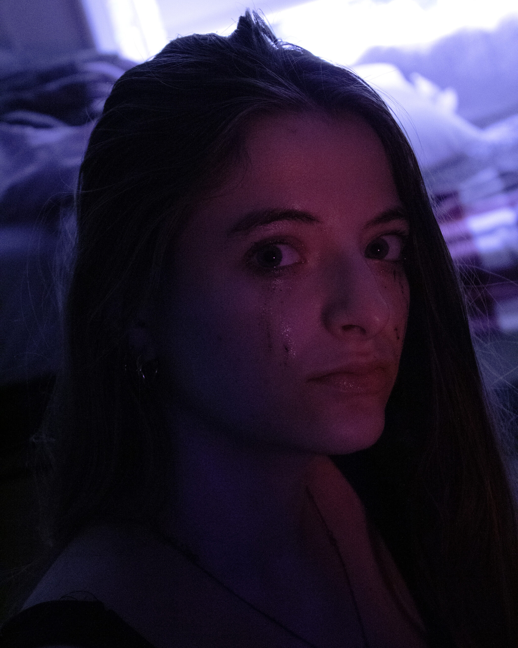 I experimented with flash and night photography, editing images for color and blur to convey disorientation and emotional intensity. Collaborating closely with my model, we explored lighting, locations, and emotional cues, capturing authentic expressions—sometimes even real tears—to convey the rawness of the experience. The final series was carefully sequenced to balance color, composition, and narrative flow, with a central image of the model confronting the audience serving as the emotional anchor of the project.
