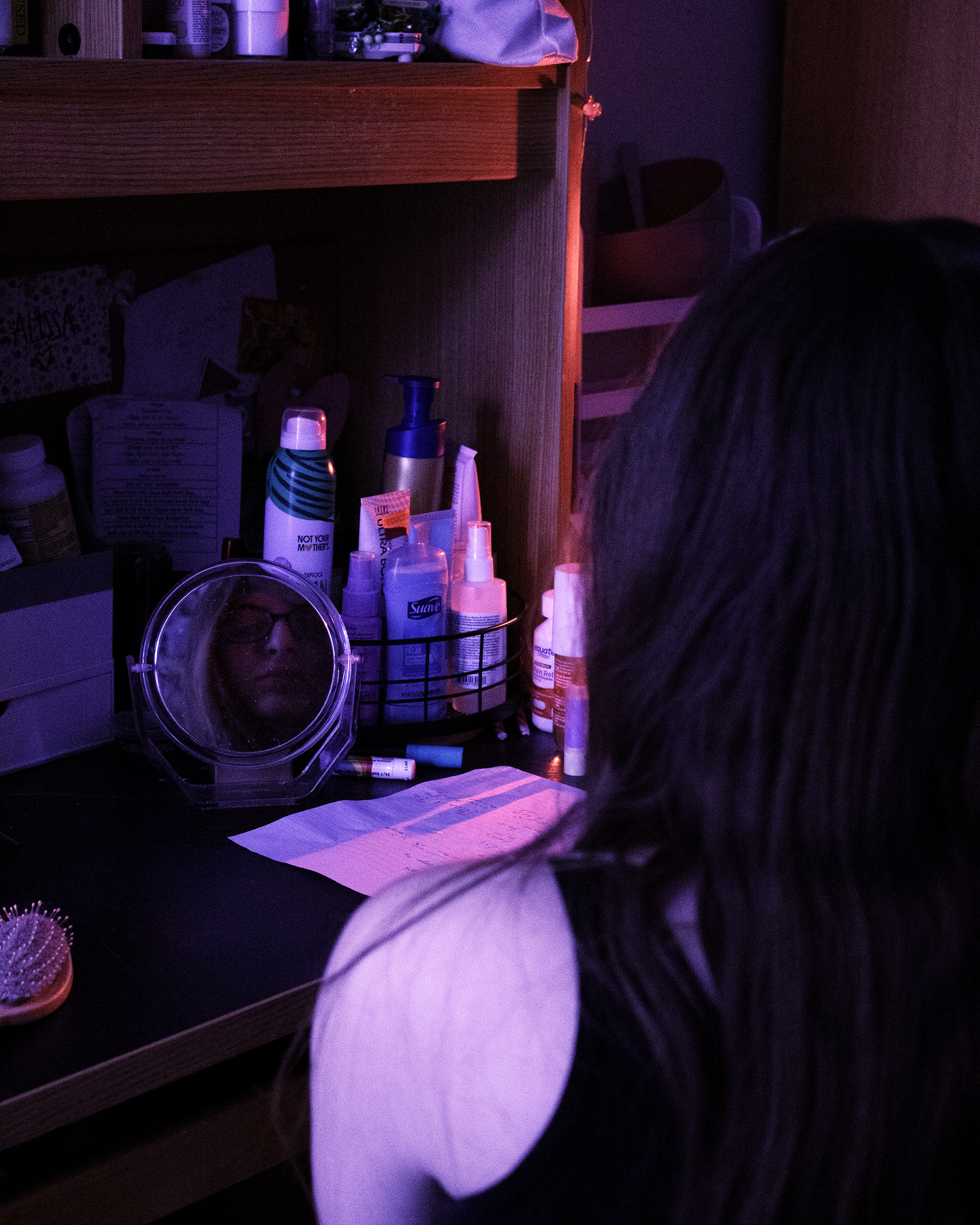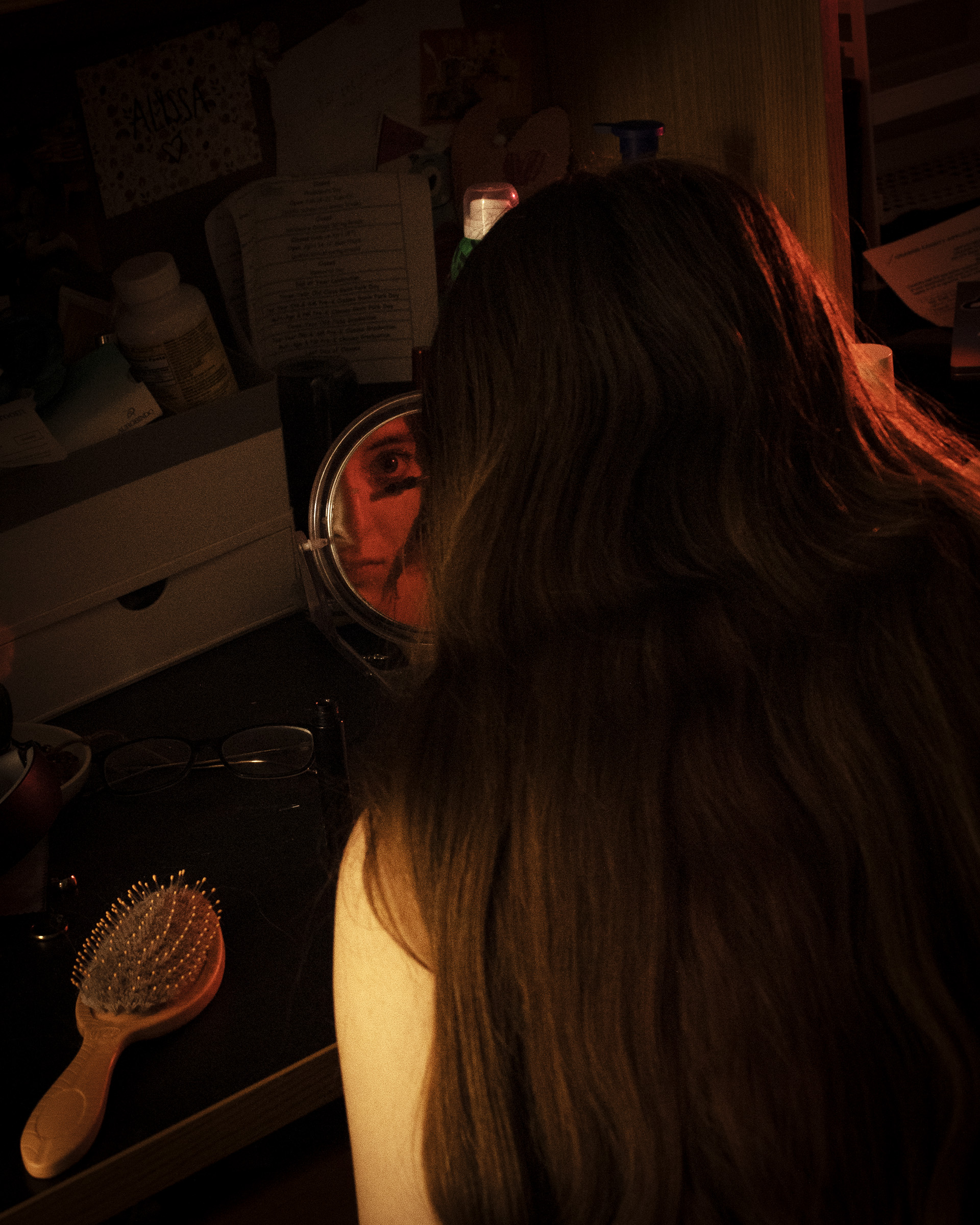Inspired by Billie Eilish’s ilomilo, this project explores themes of isolation, mental health, and the internal struggle of executive dysfunction. My goal was to immerse the audience in the perspective of my subject—sometimes confronting them directly, and other times offering a “blurry” view through the subject’s eyes. The color palette of deep blues and reds reflects fear, sadness, and anger, while unifying the series and nodding to the video game that inspired the song. Including both portrait and landscape images allowed me to depict internal and external perspectives, illustrating the invisible weight of anxiety and existential dread.